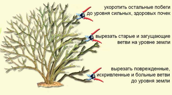 10 giorni dopo la potatura, i cespugli vengono trattati con prodotti biologici fungicidi, una soluzione di solfato ferroso o liquido bordolese da marciume e insetticidi da parassiti. Il terreno nel cerchio delle radici viene scavato con il turnover della cucitura e versato con mezzi da funghi e insetti che svernano.