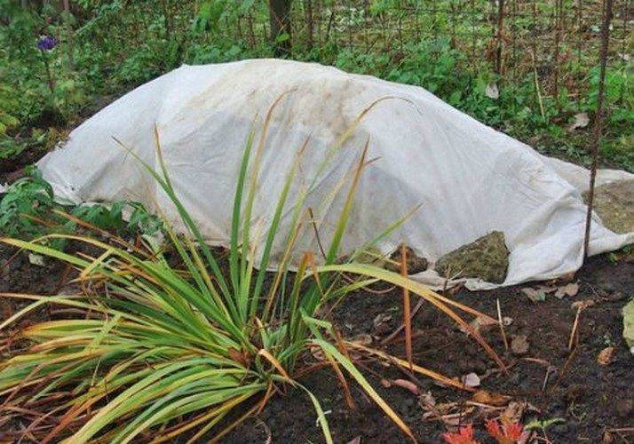 Se esiste la possibilità di gelate inferiori a -37 ° C, gli sbarchi avranno sicuramente bisogno di un riparo rinforzato. In cima ai cespugli perenni ricoperti di pacciame, sono installati degli archi, tra i quali viene versato il fogliame secco. I pannelli Lutrasil o spandbond vengono accostati. Lasciateli fino a maggio.Se le gemme si svegliano prima, il fogliame non impedirà loro di crescere e non ci sarà alcuna minaccia di congelamento.