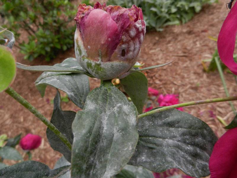 Le foglie ei fiori non soffiati iniziano a marcire, motivo per cui i boccioli della peonia si seccano. Le parti interessate devono essere completamente rimosse e il cespuglio stesso deve essere trattato con farmaci: zircone, falco, coro o strobo. Dai rimedi popolari, una soluzione con la calce è efficace.