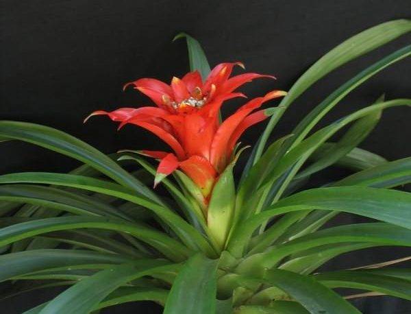 La bromelia è un fiore originario delle foreste pluviali tropicali del Sud America. È una parente dell'ananas. La pianta della Bromelia è erbacea, perenne. Belle foglie lunghe di lancetta coriacea con piccole spine formano un imbuto. Alla sua sommità, un'infiorescenza rossa o arancione cresce con un grande pre-fiore luminoso, che sembra essere una continuazione della rosetta, ma ha il colore di un fiore.