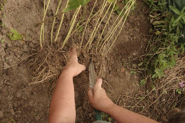 Questo metodo viene solitamente utilizzato quando è necessario preservare una pianta affetta da nematodi del fusto. Per fare questo, il cespuglio viene scavato, vengono selezionate radici carnose, che vengono tagliate in frammenti di 5-6 centimetri. Le radici sono piantate in scatole, ricoperte di sabbia.