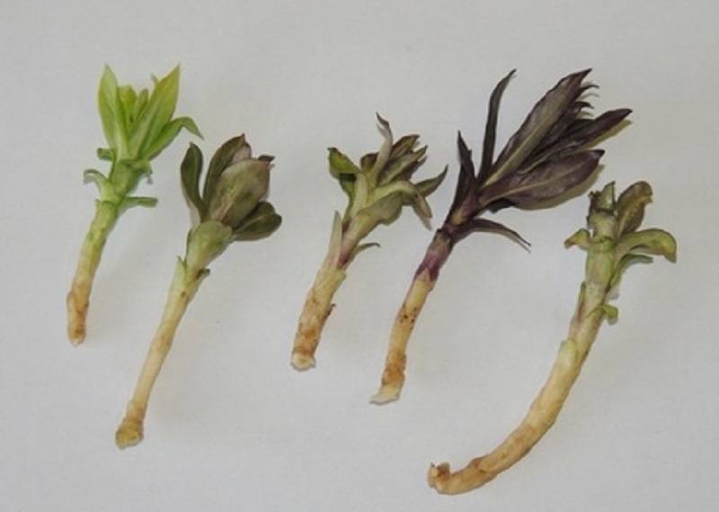 Nelle talee autunnali, le scatole vengono portate in una cella frigorifera, le piantagioni vengono conservate in queste condizioni fino alla primavera. Periodicamente, il supporto viene spruzzato con acqua, non lasciandolo asciugare.In primavera, una scatola con talee di radice, ricoperta di materiale scuro, viene portata in una stanza calda. Quando i germogli iniziano a germogliare, il rifugio viene rimosso.