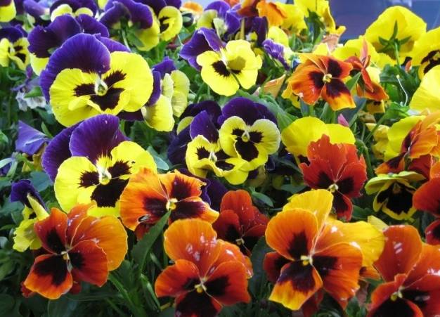 Le violette tricolori coltivate hanno una vasta gamma di colori, che vanno dal bianco al rosso-marrone con tutti i tipi di montatura, occhi, strisce.
