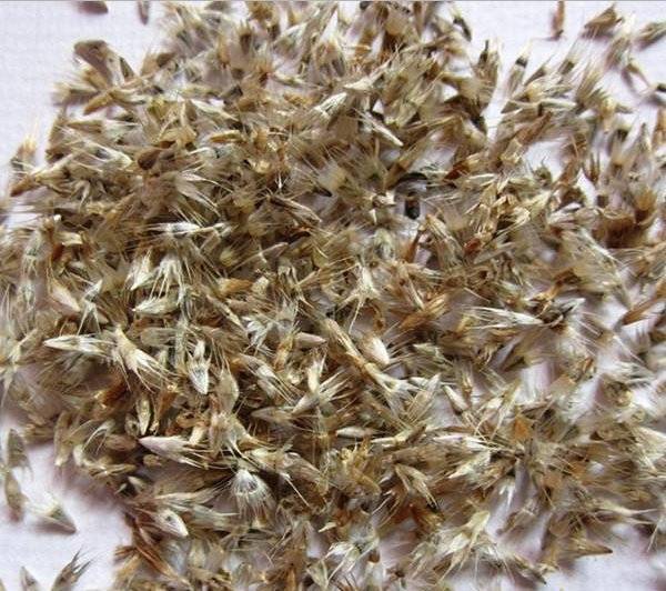 I semi di crisantemo, a prima vista, assomigliano a un dente di leone essiccato, solo 2 volte di meno. Sono a coste in un colore marrone scuro non uniforme con una superficie liscia. Le antenne secche rimangono dal bordo superiore, il che le fa sembrare volani. La forma allungata è un segno di materiale di piantagione maturo.