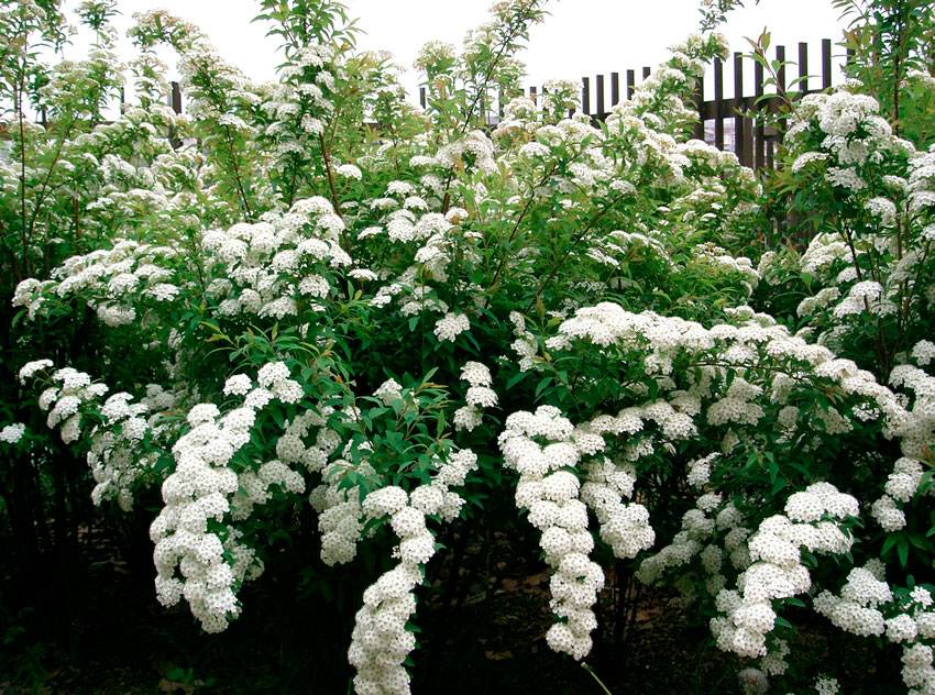 - grigio (Spiraea x cinerea). Arbusto tentacolare di 2 metri con foglie grigio-verdi. I fiori bianchi come la neve sono raccolti in infiorescenze tiroidee. L'arbusto di spirea grigia fiorisce a maggio. Per la sua compattezza e l'abbondante fioritura, la pianta è ampiamente utilizzata per scopi decorativi.