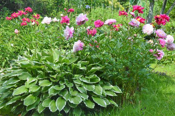 Le peonie si distinguono per i fiori grandi, quindi sono perfettamente combinate con piccole infiorescenze. I raccolti alti dovrebbero essere posizionati nella parte posteriore, i raccolti bassi dovrebbero essere portati in primo piano. Un'opzione insolita è creare una composizione di peonie di diversi colori.