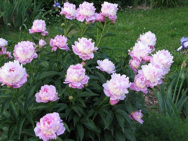 Dopo la fioritura, il bellissimo fogliame delle peonie diventa uno sfondo eccellente per altre colture. Salvia, iris, astri sono adatti come aggiunte alle peonie. Thuja e crespino stanno bene con loro.