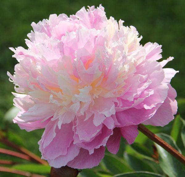 I fiori di questa varietà sono di grandi dimensioni. Le infiorescenze di spugna sono caratterizzate da una struttura originale e possono raggiungere i 16 cm di diametro. Ogni fila di fiori ha il suo colore. Allo stesso tempo, il rosa pallido si alterna al latte. Pertanto, le peonie sono spesso chiamate a tre strati. Hanno petali concavi e un profumo gradevole.