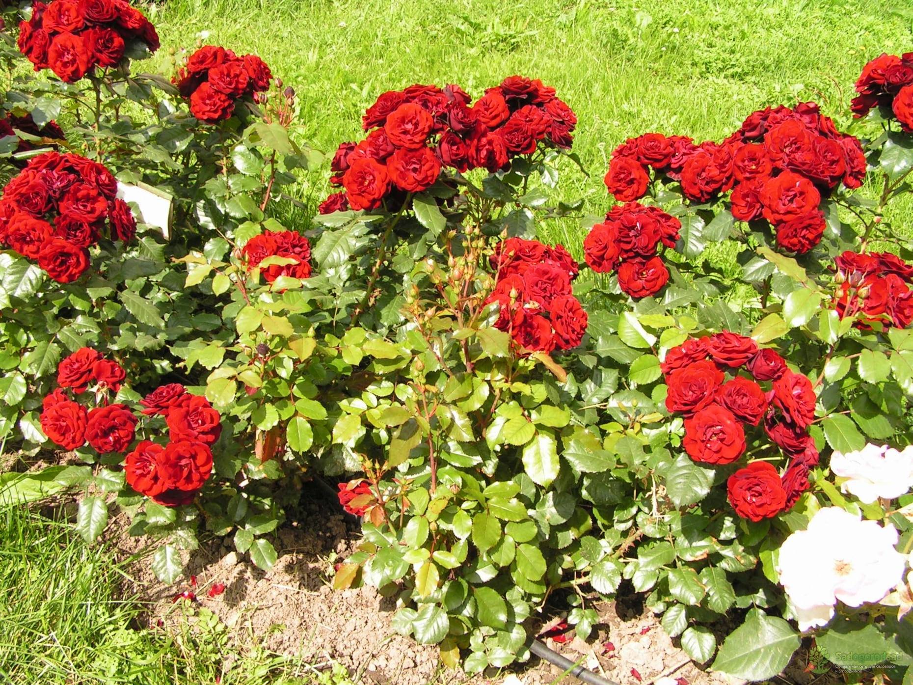Rose Lavaglut fiorisce con bellissimi fiori scarlatti, perfetta forma rotonda. Durante il periodo di fioritura, il fogliame verde scuro della pianta contrasta efficacemente con il colore brillante delle gemme.