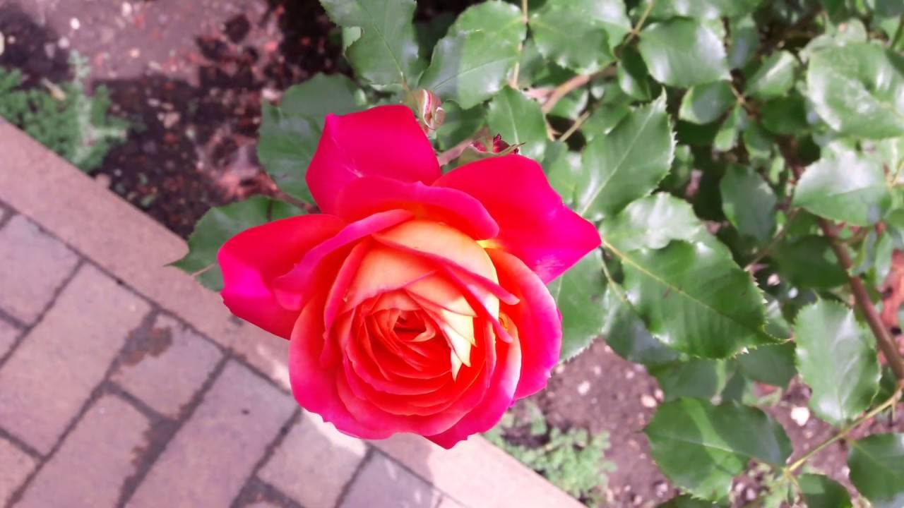 La pianta fiorisce da inizio giugno a fine ottobre. I bei fiori doppi misurano 5-8 cm La rosa di questa varietà si distingue per le brillanti sfumature giallo-rosso-arancio. Il centro del fiore si alza sopra i bordi di scarlatto, cremisi, ciliegia o rosa. L'interno della rosa ha un colore dorato o crema. I boccioli si formano in infiorescenze di 4-13 fiori ciascuna. I boccioli sono sferici oa forma di coppa. Ogni fiore ha 30-40 petali, mantengono bene la loro forma e non perdono la loro attrattiva.