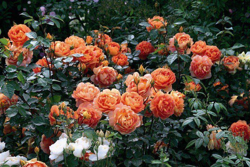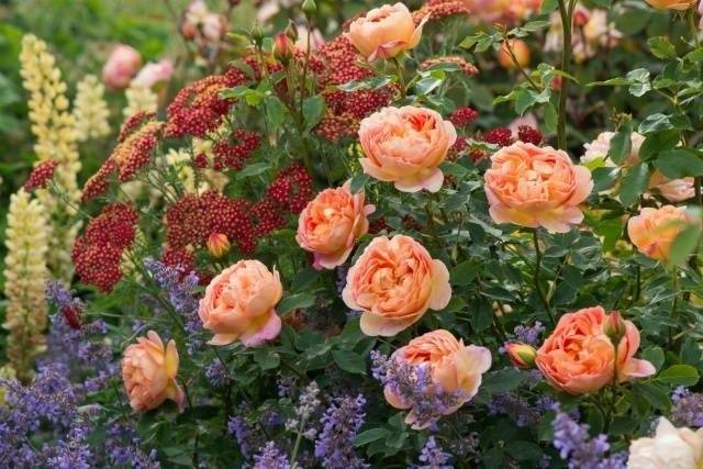 I cespugli con una fioritura bella e rigogliosa possono essere combinati con altre piante, mettendo Austin in primo piano.