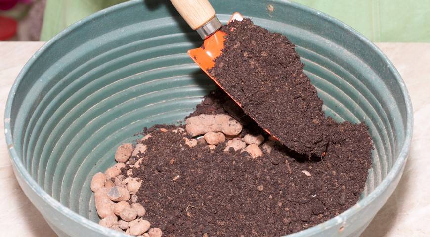 Il terriccio, che è più ossidato, deve essere cambiato. Il fiore è piuttosto esigente sullo strato di drenaggio. Dovrebbe salire di un quarto dell'altezza del vaso. La migliore opzione di drenaggio per una palma è l'argilla espansa. Puoi anche stendere una vecchia pentola di ceramica, spezzata in piccoli pezzi.