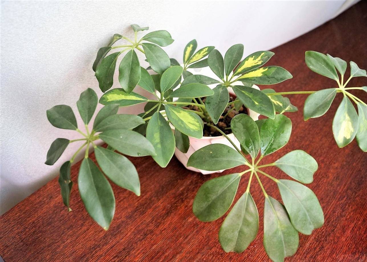 Il fiore da interno di Sheffler è interessante per l'ombra rossastra delle foglie. Con l'età, la massa verde cambia colore, ma la forma rimane ancora molto insolita. Il piatto fogliare stesso è ondulato e seghettato lungo il bordo. A casa o in ufficio, questa varietà sarà una vera decorazione.