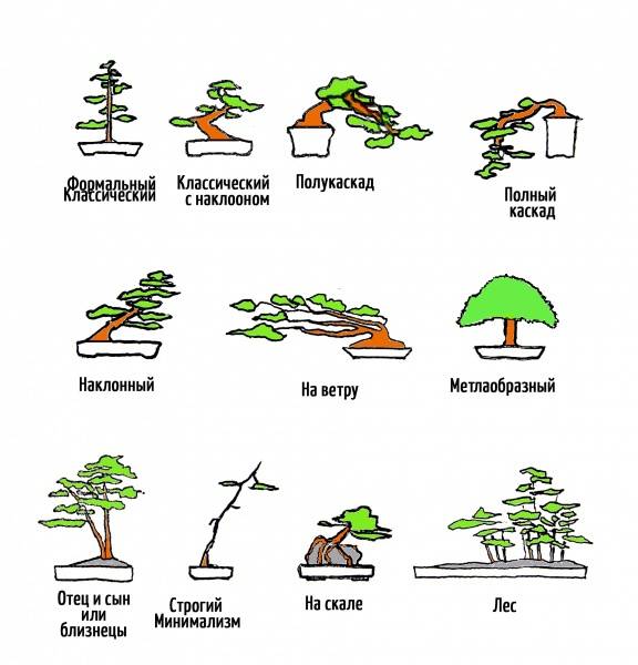Terdapat kira-kira 20 gaya asas, tetapi ia bukan contoh khusus mengenai masa depan bonsai. Kedai bunga berusaha untuk memberikan bentuk yang sesuai dengan namanya. Menurut gaya, pohon itu mungkin mempunyai ciri simetris biasa atau kelihatan seperti sedang ditekuk oleh angin kencang.