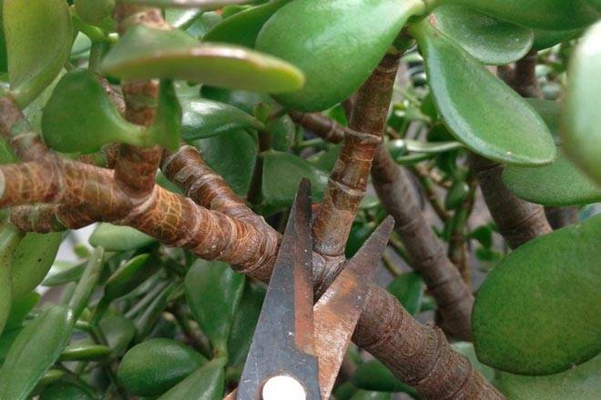 Agar tidak membahayakan Crassula, anda perlu mengetahui cara membentuk pokok wang dengan betul. Pemangkasan mesti dilakukan dengan ketat selepas pemulihan crassula dari formasi sebelumnya. Sekiranya belukar masih muda, lepaskan dahan dan daun bawah, dan wanita gemuk dewasa memerlukan pemotongan mahkota yang mendalam.