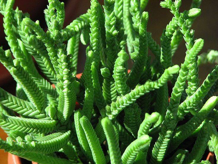 - terdapat banyak ranting, banyak dihiasi dengan daun bujur berdaging kecil. Warna utama berwarna hijau tua dengan pinggiran merah. Panjangnya tumbuh hingga 3.5-4 cm, lebarnya sekitar 2 cm.