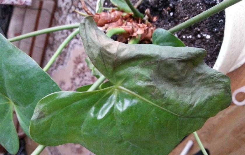 Anthurium juga boleh menjadi hitam dari kulat cescospore. Ia tidak berbahaya bagi tanaman, tetapi boleh mempengaruhi penampilannya. Pada mulanya, ia menampakkan diri dalam bentuk bintik kuning, yang kemudian berubah menjadi coklat, akibatnya, daun kering dan jatuh.
