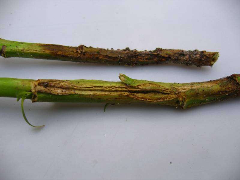 Penyebab penyakit ini adalah penggunaan bahan penanaman yang tercemar. Contohnya, ini berlaku apabila akar tanaman yang berpenyakit berpecah.