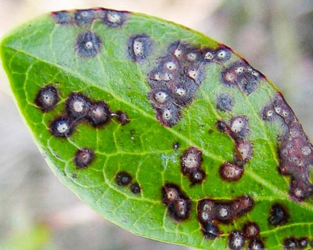 Apabila penyakit ini muncul di daun, terdapat bintik-bintik warna busuk kelabu. Lama kelamaan, kawasan mereka tumbuh, dan daunnya mulai mati. Bintik bertukar menjadi kuning atau putih. Dalam kes ini, sempadan kemerahan terbentuk di sepanjang pinggirnya.