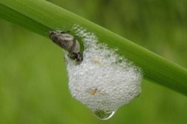 Di sini kita bercakap mengenai serangan pada tanaman oleh kutu busuk. Serangga dewasa meletakkan larva mereka di bahagian bawah daun. Mereka memakan getah tanaman, secara beransur-ansur memusnahkannya. Tanda-tanda luar dari serangan oleh sen yang merosot adalah gumpalan kecil busa, di mana larva berada.