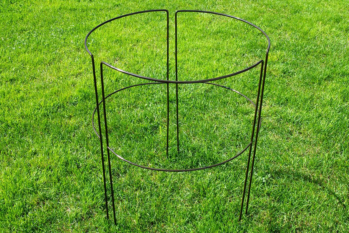 Penyokong bulat boleh dibuat dari dawai tebal. Untuk melakukan ini, ambil wayar tiga meter (dengan diameter sekurang-kurangnya 6 mm), selepas itu bulatan terbentuk darinya. Ukurannya bergantung pada ketebalan semak. Bahan tidak boleh terlalu banyak menekan dahan, hanya mengumpulkannya sedikit. Hujungnya dihala ke tanah pada sudut tepat.