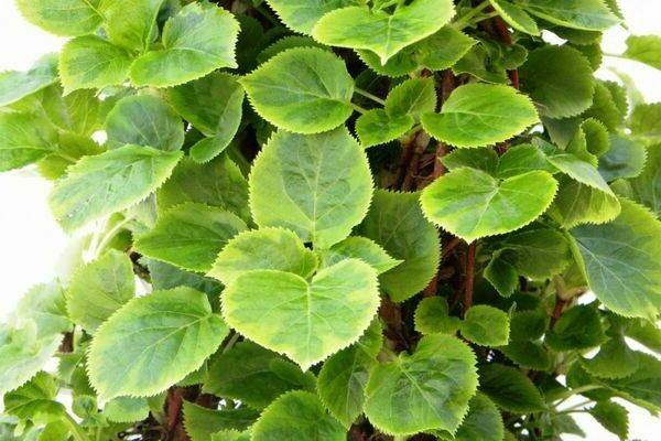 Plat daun hidrangea petioled secara semula jadi dikurniakan garis besar berbentuk hati. Diameternya boleh mencapai 10 cm. Panjang tangkai daun, ditutup dengan rambut pendek, mencapai 8 cm. Bahagian atas jisim hijau diwarnakan dengan nada yang lebih gelap daripada yang lebih rendah. Batangnya setebal hingga 5 mm. Dengan bermulanya musim luruh, dedaunan berubah menjadi kuning cerah, dan pada pertengahan Oktober ia gugur.