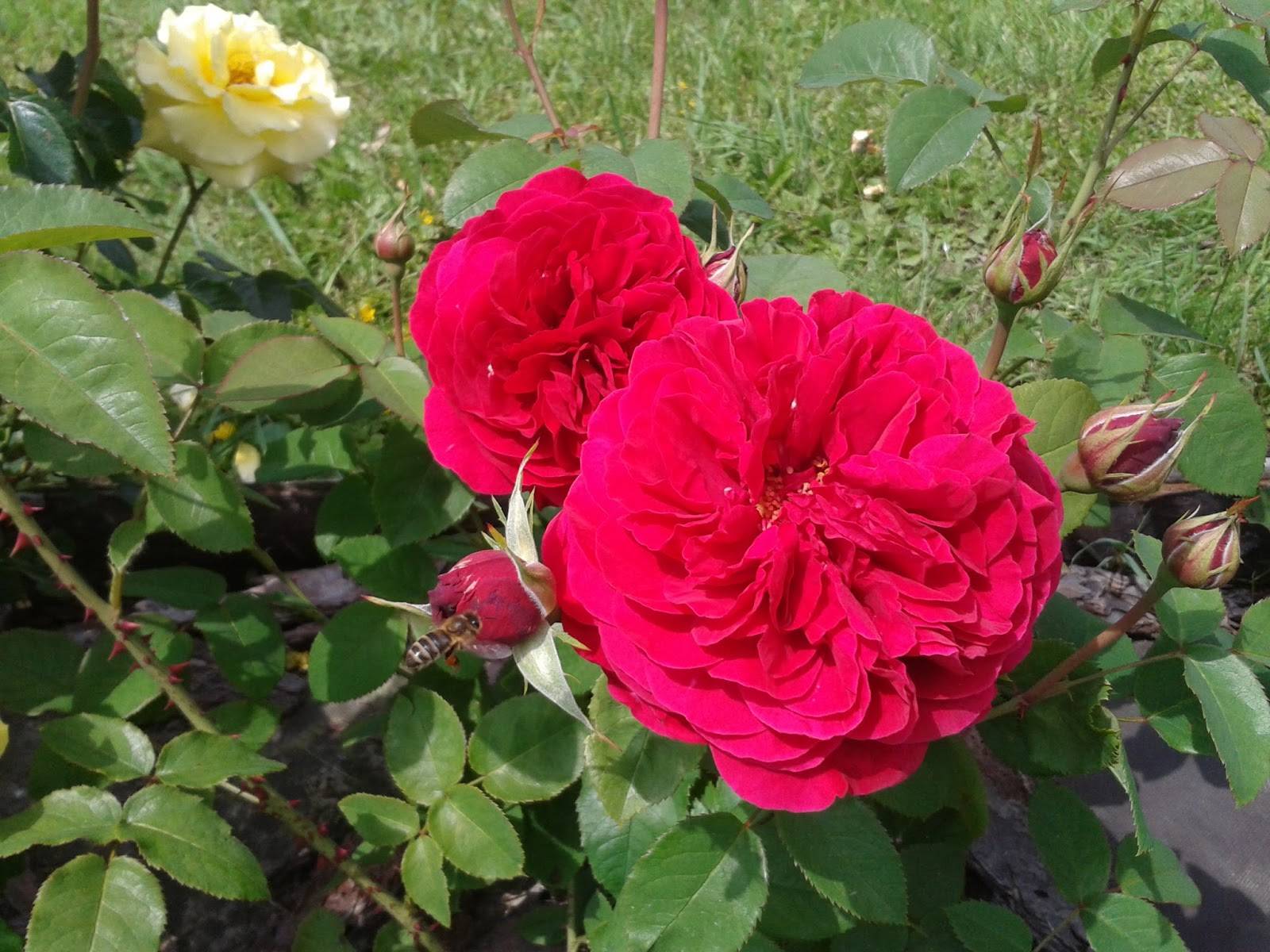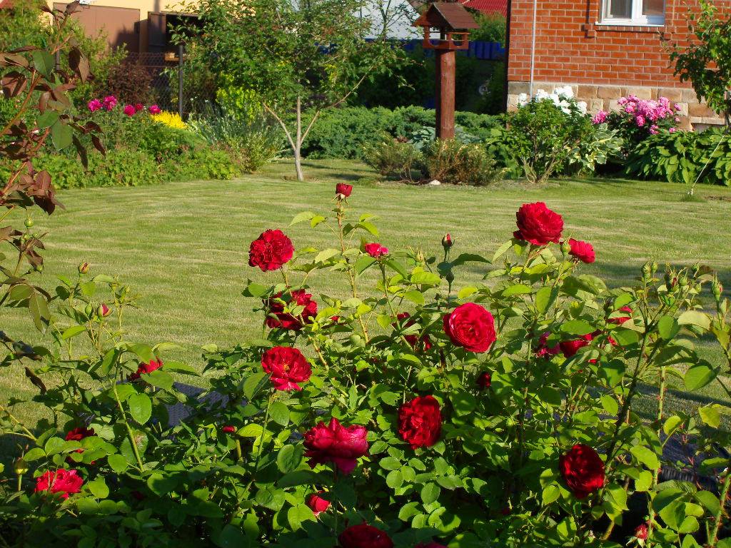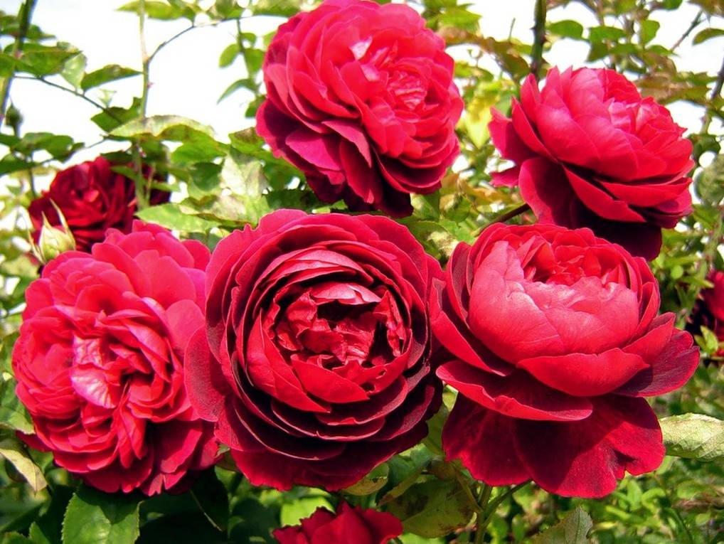 Belukar agak rendah, jarang tinggi mereka melebihi 120 cm, tetapi diameternya mencapai lebih dari 120 cm. Pucuknya kuat dan tegak, tidak membengkokkan di bawah berat perbungaan. Semasa berbunga, tunas dengan warna merah terang kaya terbentuk, dan ketika dibuka sepenuhnya, kelopak menjadi ceri gelap. Kepelbagaian ini, antara lain bahasa Inggeris, dianggap paling terang.
