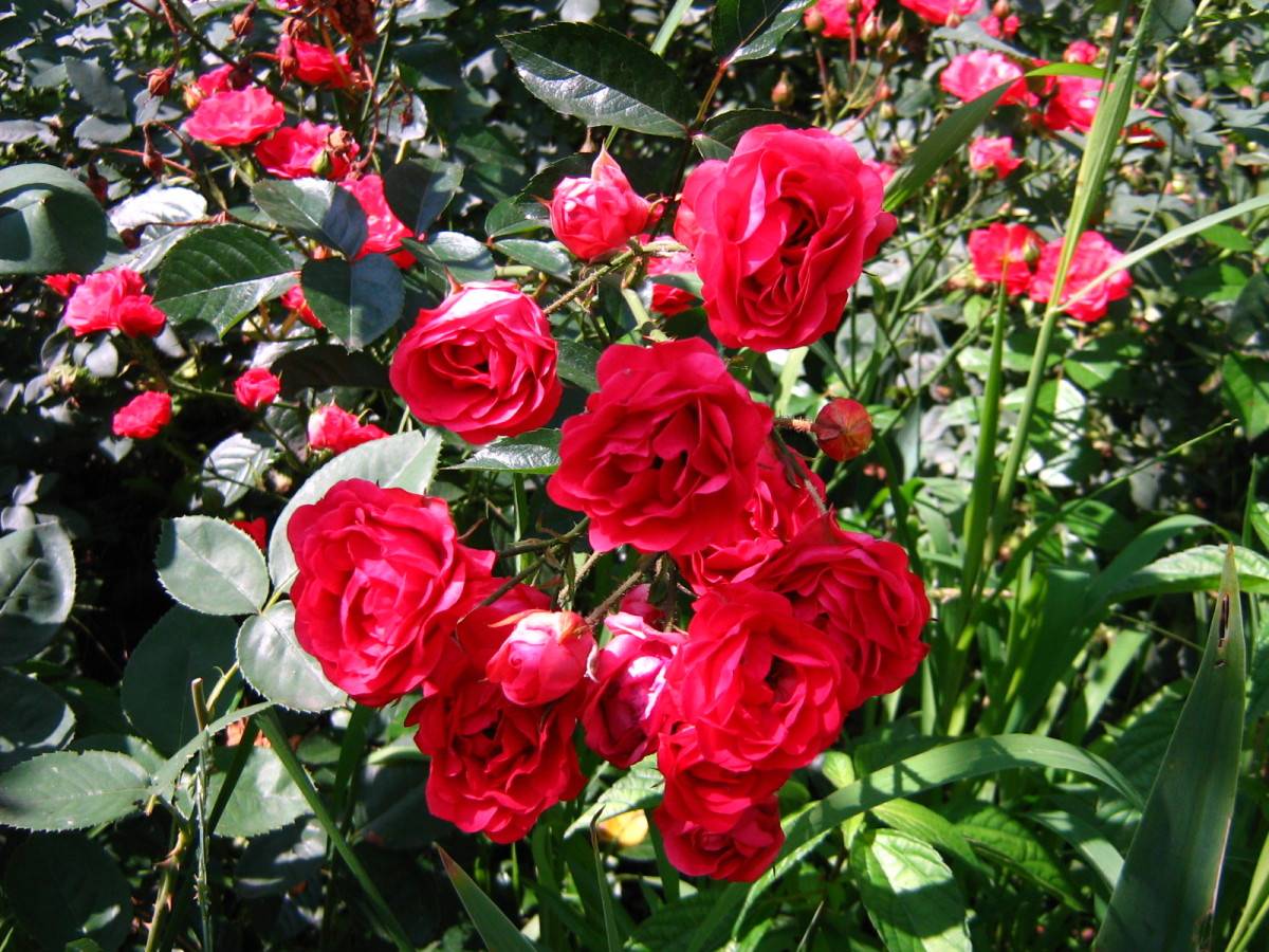- Bunga mawar taman Robusta berwarna merah atau merah, dengan benang sari kecil. Bunga mekar membentuk perbungaan 5-10 keping.