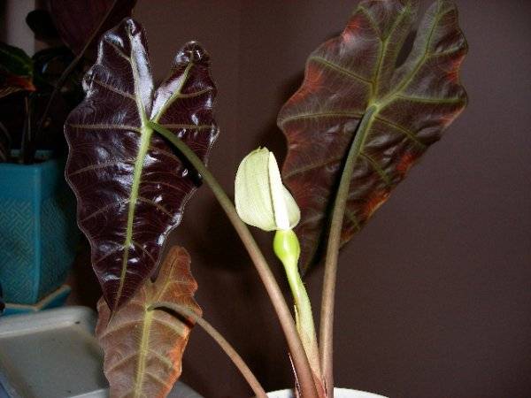 Tuinders houden van alocasia vanwege de uitstekende decoratieve eigenschappen, dankzij de grote en mooie bladplaten. De plant produceert zeer zelden een knop en alleen op volwassen leeftijd. De bloeiwijze straalt een sterk en vrij specifiek aroma uit, wat bij mensen vaak hoofdpijn veroorzaakt.