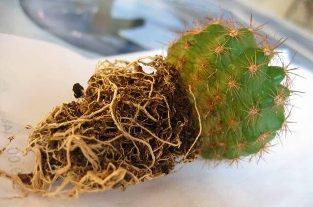 Nadat je op de wanden van de pot hebt geklopt, moet je de bloem met een pincet bij de wortelhals eruit trekken. Dan moet je de wortels zorgvuldig onderzoeken. Als er plotseling rotte en zieke onder hen zijn, moeten ze zorgvuldig worden afgesneden en behandeld met zwavel of houtskool. Vervolgens kun je de cactus overplanten in een nieuwe pot met veel drainagegaten.