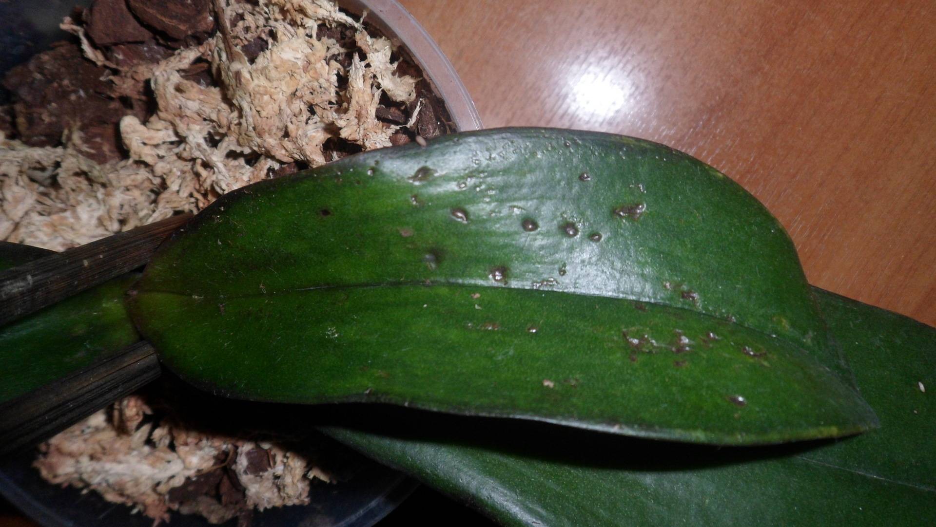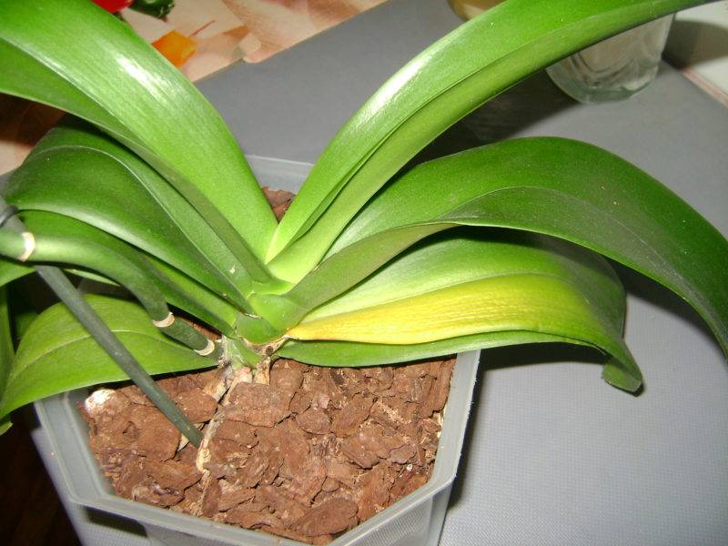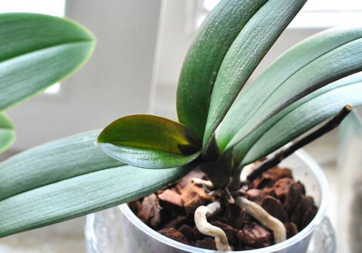 Bladproblemen beginnen meestal bij de wortels van de plant. Als het substraat geen tijd heeft om uit te drogen voor de volgende watergift, heeft dit gevolgen voor de gezondheid van de orchidee. In dit geval worden de bladeren minder elastisch, beginnen ze geel te worden, worden ze bevlekt en vallen ze eraf.