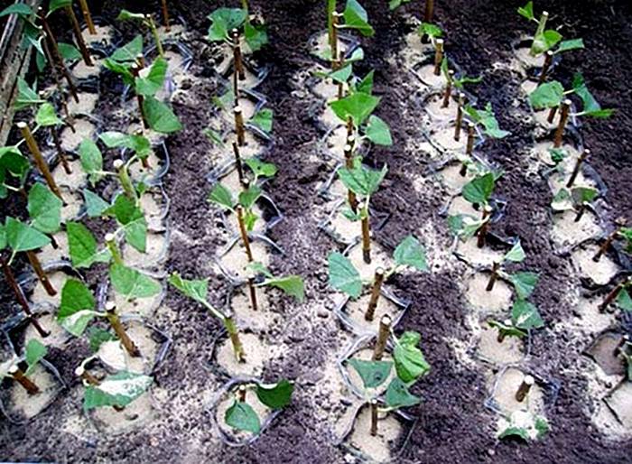 - Na deze tijd worden de scheuten geplant in vochtige, losse grond zodat de stekken licht hellend zijn.