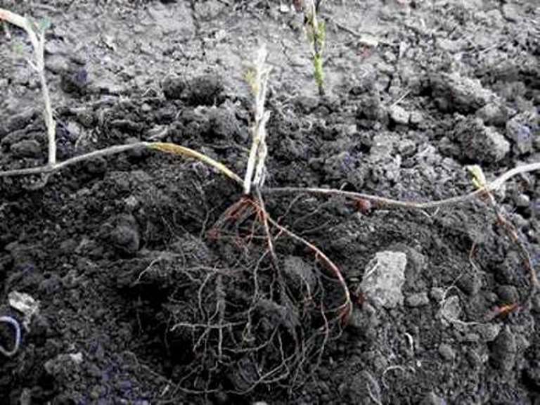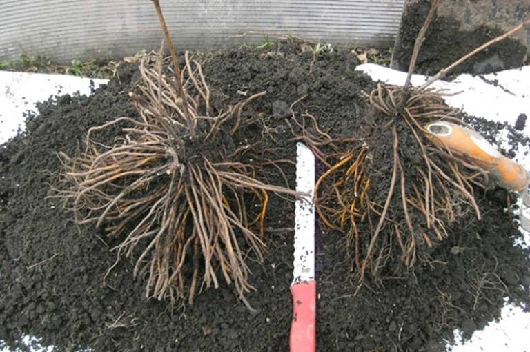 - De struik wordt uit de grond gehaald, het wortelsysteem wordt van de grond bevrijd. De wortels worden onder stromend water gewassen.