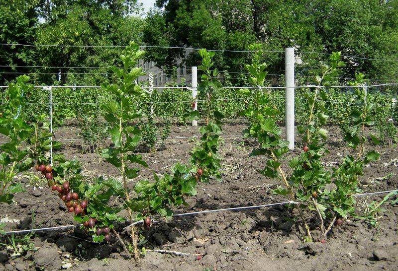 За обикновените насаждения от разстилащи се храсти от цариградско грозде често се използва техниката на решетките, изкопаване на здрави опори в краищата на реда и издърпване на тел между тях, към която след това са завързани издънките. Обикновено се образуват 3 нива жартиери на разстояние 50, 80 и 100 см от нивото на земята. Последователността на рязане стъпка по стъпка е както следва: