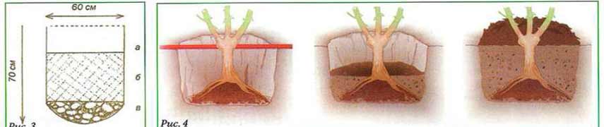 - Cave um buraco de 60 × 60 cm com uma profundidade de 60-70 cm. Uma drenagem rasa é despejada no fundo e, em seguida, uma camada de solo fértil. Não é aconselhável adicionar fertilizantes minerais neste momento. Primeiro você precisa dar tempo para a flor criar raízes.
