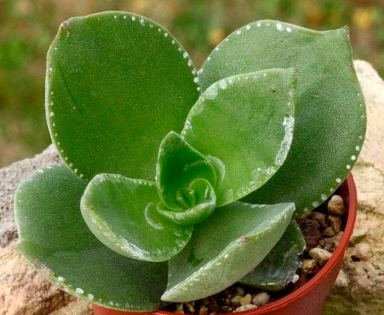 Сорт ампел, нарастващ до 50-60 см височина. Месестите сиво-зелени листа са леко заострени в края. По ръба има малки бели петна, които са послужили за името на вида.