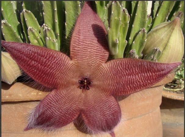 - Гигантската стапелия се нарича така заради впечатляващите размери на цветето - до 35 см в диаметър. Stapelia gigantea прилича на храст от изправени стъбла, наподобяващи месести пръчки с височина до 20 см. Цветът прилича на петолъчна жълта звезда, покрита с червени косми.