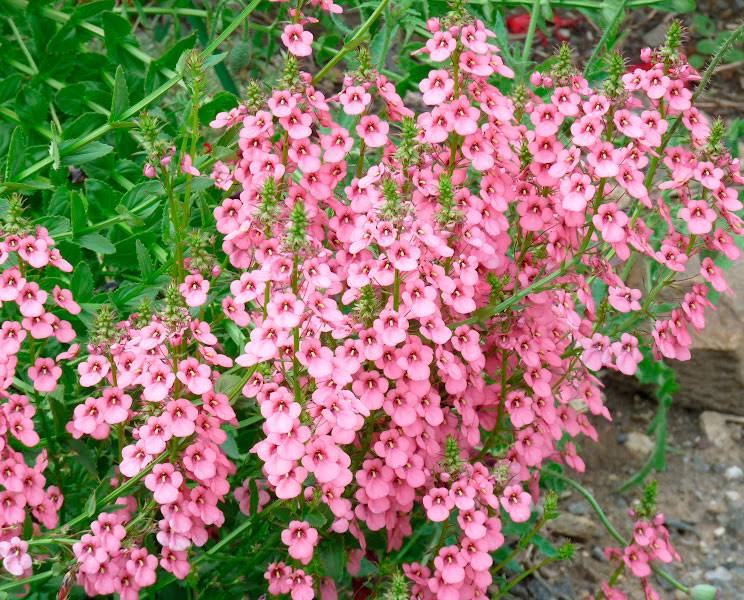Diastia มีหนวดมีเคราเป็นพืชเตี้ยที่มีความสูงไม่เกิน 30 ซม. มีใบสีเขียวเข้มขนาดเล็กเป็นพุ่มกว้าง บุปผาตลอดฤดูร้อน มีช่อดอกจำนวนมากบนพุ่มไม้ แต่มีขนาดเล็ก ตรงกลางมักมีสีเหลืองและขอบกลีบมีสีชมพูอ่อน บ่อยที่สุดประเภทนี้ประจำปีคุณสามารถซื้อเมล็ดพันธุ์ในร้านได้