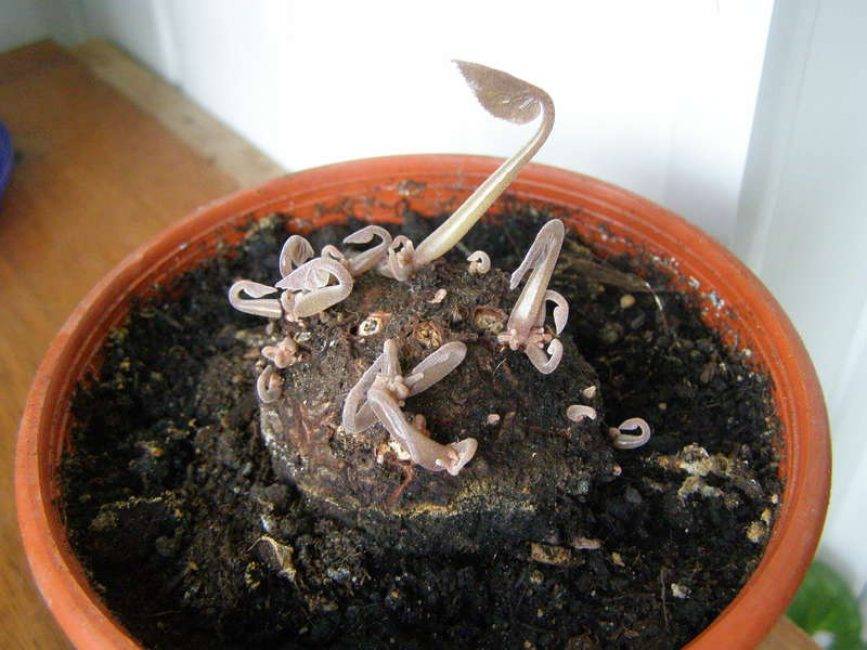 หม้อไซคลาเมนถูกเลือกขึ้นอยู่กับขนาดของหลอดไฟ - ภาชนะควรมีขนาดใหญ่กว่าเส้นผ่านศูนย์กลางของราก 3-4 ซม. หากความจุน้อยระบบรากจะเริ่มเน่าและดอกไม้จะไม่บาน