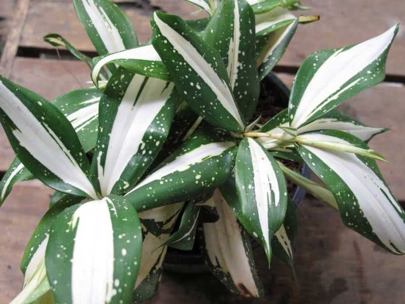 - Dracaena Deremskaya พืชที่มีใบสีเขียวเข้มประดับด้วยแถบสีขาวสองแถบตามแนวยาว ใบสามารถงอได้ที่ปลาย
