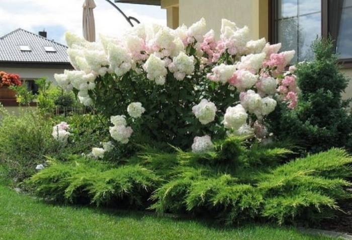 พุ่มไม้ที่ออกดอกติดกับพุ่มไม้สีเขียวของ Hawthorn, cotoneaster หรือ Juniper ดูสวยงาม การเลือกสิ่งที่จะปลูกด้วยไฮเดรนเยียจากพืชเหล่านี้พวกเขามักจะตัดสินใจเลือกสายพันธุ์จูนิเปอร์ที่เขียวชอุ่มตลอดปีที่แผ่กิ่งก้านสาขา พันธุ์ต้นสนชนิดหนึ่งที่มีเกล็ดสีฟ้าจะไม่สูญหายไปข้างพุ่มไม้ออดิไซและจะเป็นเครื่องประดับที่ยอดเยี่ยมสำหรับด้านหน้าของบ้าน