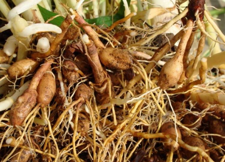 ระบบรากของเฮเมโรแคลลิสเป็นกลุ่มของเส้นใยที่มีเส้นใยมีรากที่หนาขึ้นรกซึ่งดอกไม้จะสะสมสารอาหารเช่นเดียวกับพืชที่มีกระเปาะ ดังนั้นบางครั้ง daylilies จึงถูกเรียกว่าพืชกระเปาะและส่วนที่หนาขึ้นของรากจะสับสนกับหลอดไฟของดอกลิลลี่จริง (Latin Lilium)