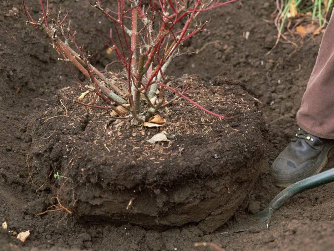 เมื่อย้ายปลูกดอกไม้ที่โตเต็มวัยพุ่มไม้จะถูกขุดด้วยก้อนดิน (ยิ่งมีก้อนมากเท่าไหร่ก็ยิ่งดี) กระบวนการนี้อำนวยความสะดวกก่อนการรดน้ำ เพื่อความสะดวกหน่อจะถูกมัดด้วยเชือก หลังจากขุดแล้วพุ่มไม้จะถูกวางลงบนผ้าหรือวัสดุอื่น ๆ เพื่อย้ายไปยังตำแหน่งใหม่