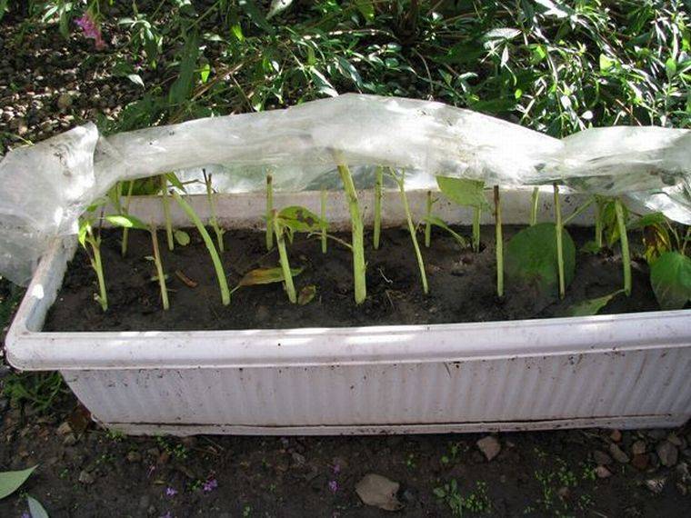เพื่อให้ได้วัสดุปลูกในช่วงต้นฤดูร้อนให้ตัดยอดที่มีใบ 3 คู่ซึ่งสามารถหยั่งรากได้ที่เตียงในสวน อย่าลืมใส่ฝาขวดพลาสติกที่ตัดแล้วไว้ด้านบน ด้วยการรูตที่ประสบความสำเร็จพุ่มไม้เล็ก ๆ จะถูกปลูกในสถานที่ถาวรในปลายเดือนพฤษภาคมฤดูใบไม้ผลิหน้า