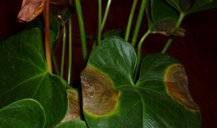 Bazen antoryumda yaprakların sadece uçları kurur. Bu, ya hava çok kuru olduğu için ya da belirli böcek zararlıları ortaya çıktığında olur. Aynı soruna çok uzun süre güneşlenmek de neden olabilir ve bu da güneş yanığına neden olabilir. İkincisi yapraklarda sarı veya kahverengi lekeler olarak görünür.