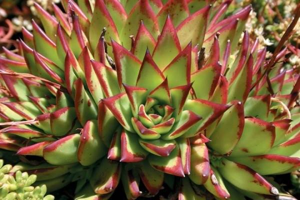 Büyük bitkiler 15 cm çapa kadar rozetlere sahiptir, bebekler uzun süreçlerde gelişir. Yaprakların ortalama genişliği 2 cm, uzunluğu 5 cm'dir Çiçek salkımları pembemsi veya parlak kırmızı bir gölgeye sahiptir, üstte sarı bir kenar vardır.