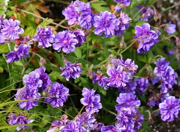 Geranium Himalayan Plenum принадлежи към семейство Гераниум, но също така е двойно цвете. Неговите буйни лилави венчелистчета образуват големи съцветия на висок храст. Това растение може да се отглежда в градина или цветна леха.