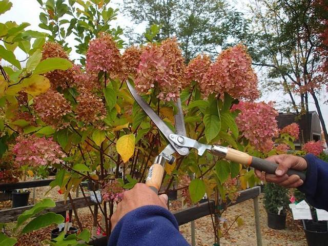 Като подготовка за периода на почивка е необходимо да премахнете листата, да завържете хортензията в куп, да направите хълбоци и да инсталирате опори.