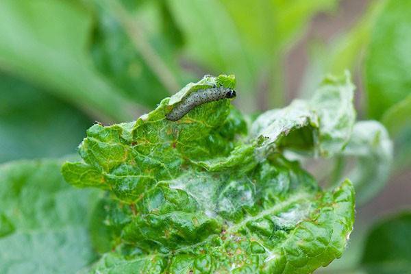 - малки дупки, изгризани от гъсеници, с течение на времето от листата остават само вени;