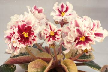 - глоксиния. Има лилави, бели и червени листа, които при допир наподобяват кадифе. Глоксинията много прилича на листата на теменужка.